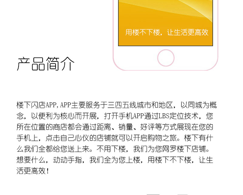 樓下閃店APP,APP主要服務(wù)于三四五線城市和地區(qū),以同城為概念,以便利為核心而開(kāi)展,打開(kāi)手機(jī)APP通過(guò)LBS定位技術(shù),您所在位置的商店都會(huì)通過(guò)距離、銷量、好評(píng)等方式展現(xiàn)在您的手機(jī)上,點(diǎn)擊自己心儀的店鋪就可以開(kāi)啟購(gòu)物之旅。樓下有什么我們?nèi)冀o您送上來(lái)。不用下樓,我們?yōu)槟W(wǎng)羅樓下店鋪。想要什么,動(dòng)動(dòng)手指,我們?nèi)珵槟蠘牵脴窍虏幌聵?,讓生活更高效?/span>